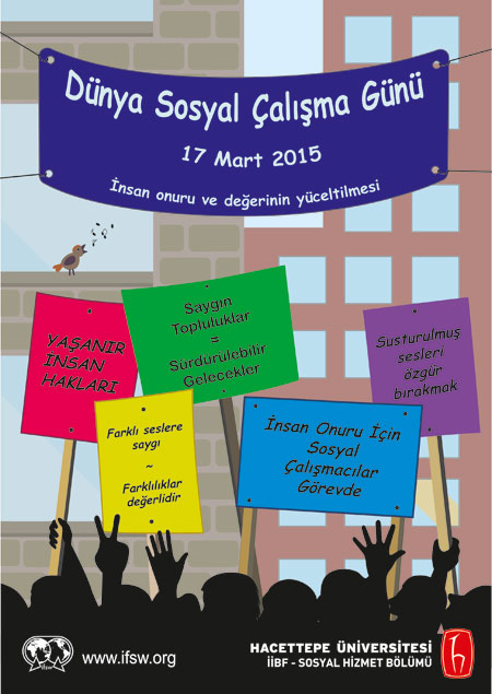 | Uluslararası Sosyal Çalışmacılar Federasyonu yayınladığı bir yazıda 2015 yılında 17 Mart gününün Dünya Sosyal Çalışma Günü (World Social Work Day).olarak kutlanacağını bildirmiştir. Bu günlerde sosyal çalışmanın ve sosyal çalışmacıların sorunları gündeme taşınmakta, uluslararası düzeyde farkındalıkların artması için çalışmalar yapılmakta ve sosyal ve ekonomik çözümler üzerine görüşler dile getirilmektedir. Ayrıca USÇF tüm ülkelerde kullanılmak üzere bir afiş hazırlamakta ve bunun tüm ülkelerden kendi dillerinde yayınlanmasını istenmektedir. Afiş her yıl değişmektedir. Bu yılın afişi sosyal çalışmanın temel belgilerini (motto) ele alan kitleselleşmeyi konu almıştır. Geçen yıl sosyal çalışmanın ilgilendiği sorunları yansıtan tişörtlerle bir afiş hazırlanmıştı. Bu afiş küresel sorunların çözümlerini temsil etmesi adına kullanılmıştı. Dünya Sosyal Çalışma Günü Türkiye’de Facebook, Youtube gibi internet sayfalarında gönüllü meslek elemanlarının girişimiyle sınırlı olarak anılmakta ve tanıtılmaktadır. Türkiye’de sayıları 65 dolayında olan Sosyal Hizmet Yükseköğretim kurumlarından sadece birkaçı bugüne kadar kendi içlerinde bir sunuşla ya da bir toplantıyla bugünü kutladılar, kutluyorlar. |